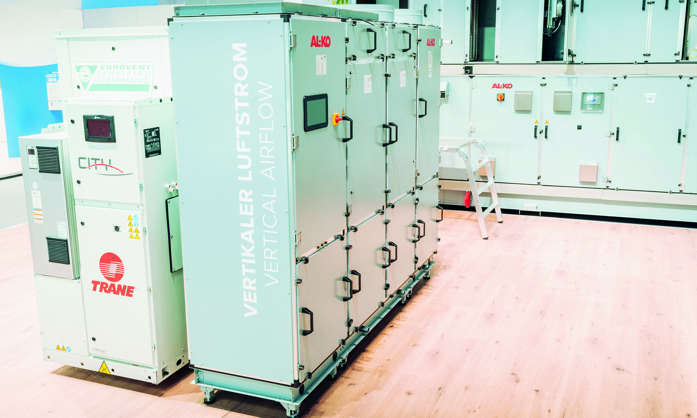 Die Schwesterunternehmen Al-Ko Therm GmbH, Jettingen-Scheppach, und Trane Deutschland GmbH, Oberhausen, präsentieren zwei Produktneuheiten, die Lüftungsgeräte von Al-Ko mit Wärmepumpen von Trane kombinieren. Speziell für Einsatzorte, die nur wenig Platz für die Installation bieten, ist das modular aufgebaute Lüftungsgerät „Al-Ko AT4 Complete“ (5.000 bis 20.000 m³/h Luftvolumenstrom) nun auch mit horizontalen Rotoren sowie neuen Komponenten erhältlich, die eine vertikale Luftführung ermöglichen. Kombiniert wird das Lüftungsgerät mit der Hochtemperatur-Wasser/Wasser-Wärmepumpe „City RTSF HT“ (100 bis 370 kW Heizleistung) von Trane, die über eine patentierte Schraubenverdichtertechnologie verfügt und als Standardgerät Warmwasser bis 110 °C liefern kann. Kältemittel ist R1233zd(E) (GWP 3,88) der Sicherheitsklasse A1 (nicht brennbar).