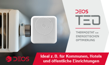 Mit dem patentierten, batterielosen Heizkörperthermostat DEOS TEO regeln Sie zentral die Raumtemperatur, nach Zeit-/Kalenderangaben oder automatisch bei geöffnetem Fenster. So reduzieren Gebäudebesitzer ihre Energiekosten nachweislich um bis zu 40 %. Vorteil: Kabellose, schnelle Installation dank LoRaWAN Funktechnologie. Jetzt informieren!