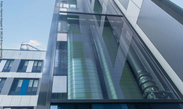 Klimatisierung, die man sieht und doch kaum wahrnimmt: Unsere ovalen Wickelfalzrohre fügen sich harmonisch in die gläserne Aufzugskonstruktion des Klinikums Braunschweig ein. Eine elegante Lösung für hohe Ansprüche an Funktion und Design. m+a-Ovalrohre: platzsparend, praktikabel, formschön.