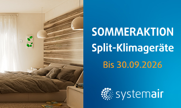 Jetzt Systemair Split-Klimageräte sichern – AKTION bis 30.09.2026. Smarte Luft/Luft-Wärmepumpen mit R290 kühlen im Sommer und heizen im Winter effizient. Multi-Split Innen- und Außengeräte inkl. WiFi-Modul lassen sich flexibel kombinieren – für passgenaue Klimalösungen.