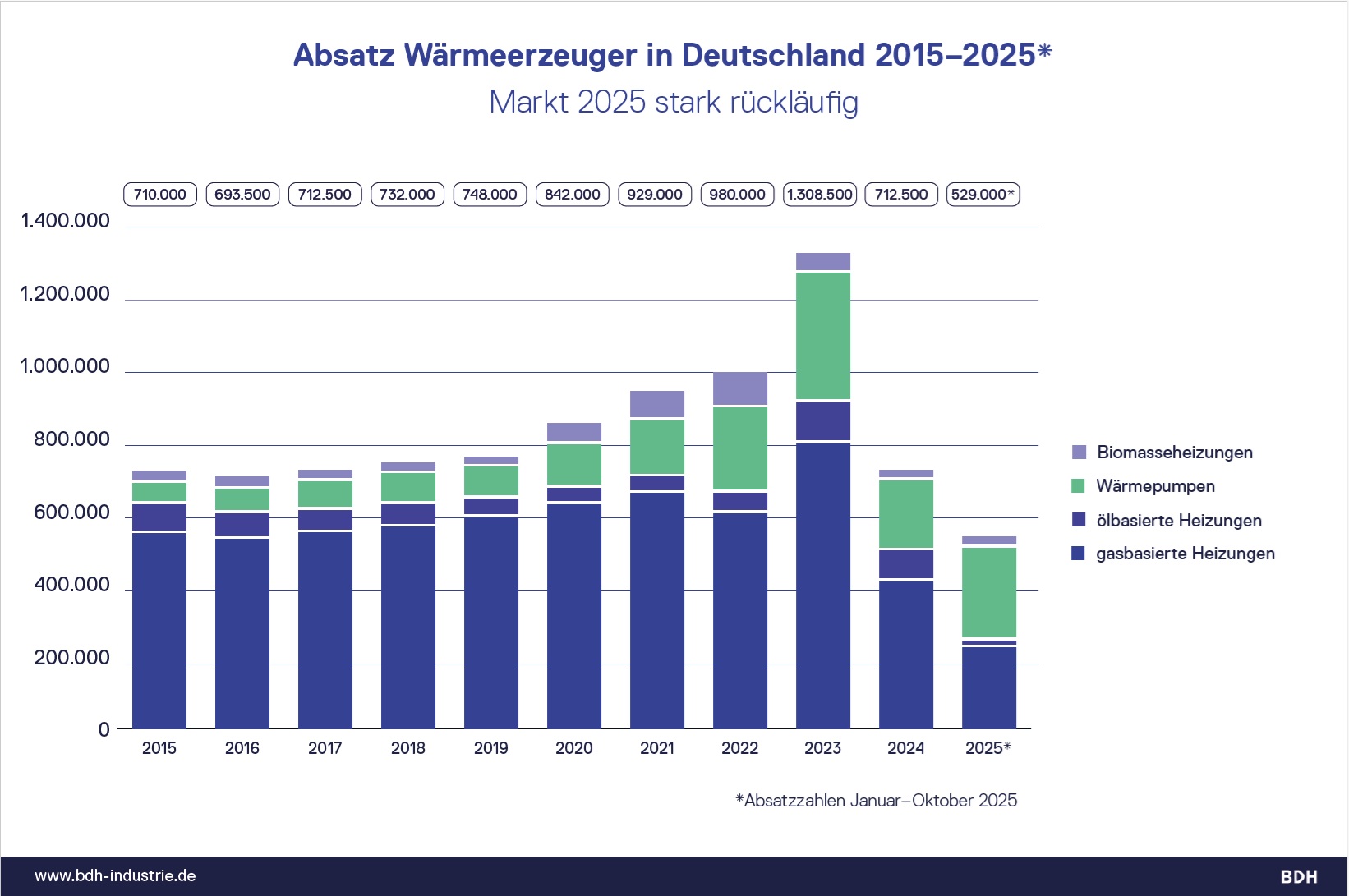 Mit Blick auf die aktuellen Zahlen erneuert der BDH seinen Appell an die Bundesregierung, rasch für klare und verlässliche Rahmenbedingungen zu sorgen. Die Fehler der Ampelkoalition dürften sich nicht wiederholen. Statt öffentlicher politischer Auseinandersetzungen brauche es laut Bundesverband ein „geschlossenes und entschlossenes Vorgehen“ – insbesondere bei Förderung, CO2-Bepreisung und Energiepreisen einschließlich Stromsteuerentlastung.