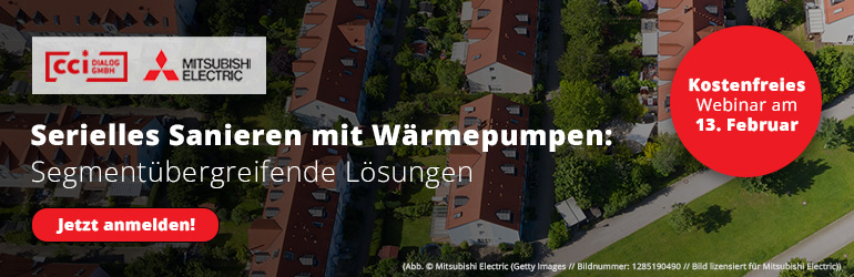 Übermorgen, am 15. November, lädt die cci Dialog GmbH gemeinsam mit dem Partner Mitsubishi Electric um 10 Uhr zum Webinar ein. Diesmal widmet sich Referent Christian Schreiner der Frage, warum Großwärmepumpen im Geschosswohnungsbau eine Lösung sind und zeigt auf, wie die Geräte dort zur Heizungswasser- und Trinkwarmwassererwärmung eingesetzt werden können. Noch können Sie sich für das kostenfreie Webinar anmelden.