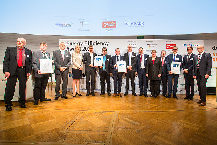 2016 zeichnete die dena Capita, Pilkington, Thelen und Rauschert mit dem Energieeffizienzpreis aus. (Abb. dena) Für Projekte, die bei der Umsetzung der Energiewende besonders wirkungsvoll sind, vergibt die Deutsche Energie-Agentur (dena) im Rahmen ihrer Initiative EnergieEffizienz seit 2007 den Energy Efficiency Award. Der Award ist mit Preisgeldern von 30.000 € dotiert und steht unter der Schirmherrschaft des Bundesministeriums für Wirtschaft und Energie (BMWi). Der Wettbewerb wird realisiert mit Unterstützung der Danfoss GmbH und der Kreditanstalt für Wiederaufbau (KfW).