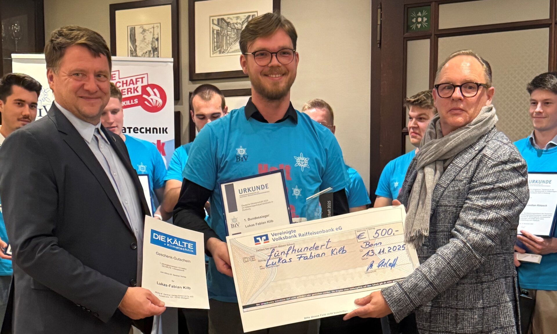 Der Bundesinnungsverband des Deutschen Kälteanlagenbauerhandwerks hat vom 11. bis 13. November im Informationszentrum der IKKE Informationszentrum für Kälte-, Klima- und Energietechnik gGmbH, Duisburg-Rheinhausen, die diesjährige Deutsche Meisterschaft im Kälteanlagenbauerhandwerk (ehemals „Bundesleistungswettbewerb“) ausgerichtet. Zehn Teilnehmer aus verschiedenen Bundesländern gingen für ihre Handwerkskammern und Ausbildungsbetriebe an den Start. Den ersten Platz sicherte sich Lucas Fabian Kilb von der Kühn Kälte-Klimatechnik aus Hofheim in Hessen. Felix Ziegler von der Kraft.Cool GmbH aus Roth in Bayern belegte den zweiten Platz.
