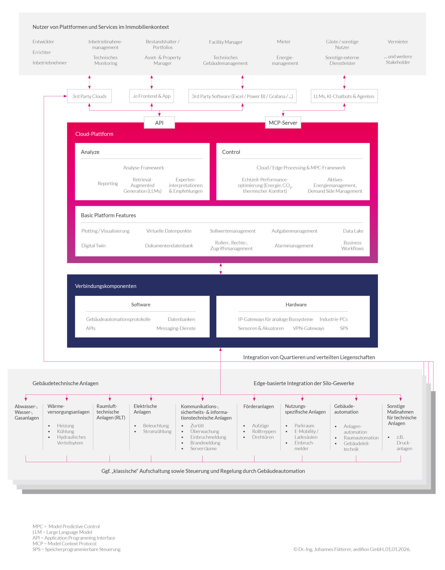 Damit entsteht eine neue Kernanforderung: Gebäude benötigen eine digitale Infrastruktur, die all diese Aufgaben orchestriert. Die Cloud‑Plattform übernimmt diese Rolle nicht nur als bloßer Datenspeicher. Auf die Betriebsoptimierung von Gebäuden spezialisierte Cloud-Plattformen bieten zusätzlich die Möglichkeit, die verfügbaren Betriebsdaten mit Hilfe von künstlicher Intelligenz zu strukturieren, analysieren und sogar direkten Einfluss auf den Gebäudebetrieb zu nehmen, um erkannte Optimierungsmaßnahmen direkt umzusetzen. Die Cloud‑Plattform wird somit zum digitalen Fundament, das gleichermaßen Effizienz, Nachhaltigkeit, Netzdienlichkeit und damit Wertstabilität ermöglicht. Sie ersetzt die klassische Gebäudeautomation nicht, sondern ergänzt sie.