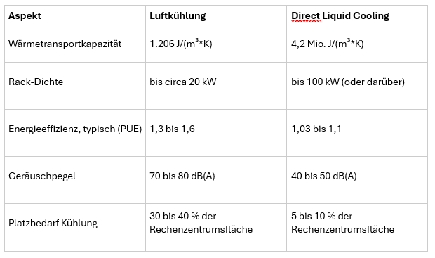 Zum Hintergrund: Wasser transportiert Wärme erheblich effizienter als Luft. Da es eine höhere Wärmekapazität und Dichte hat, ergibt sich eine etwas 3.500-fach höhere Wärmetransportkapazität. Während Luft eine spezifische Wärmekapazität von 1,01 kJ/(kg*K) besitzt, beträgt diese für Wasser 4,19 kJ/(kg*K), was zusammen mit der höheren Dichte von Wasser mit 997 kg/m³ gegenüber 1,2 kg/m³ bei Luft zu diesem Vorteil von Wasser als Wärmetransportmedium führt. Diese physikalische Grundwahrheit treibt die DLC-Revolution an.