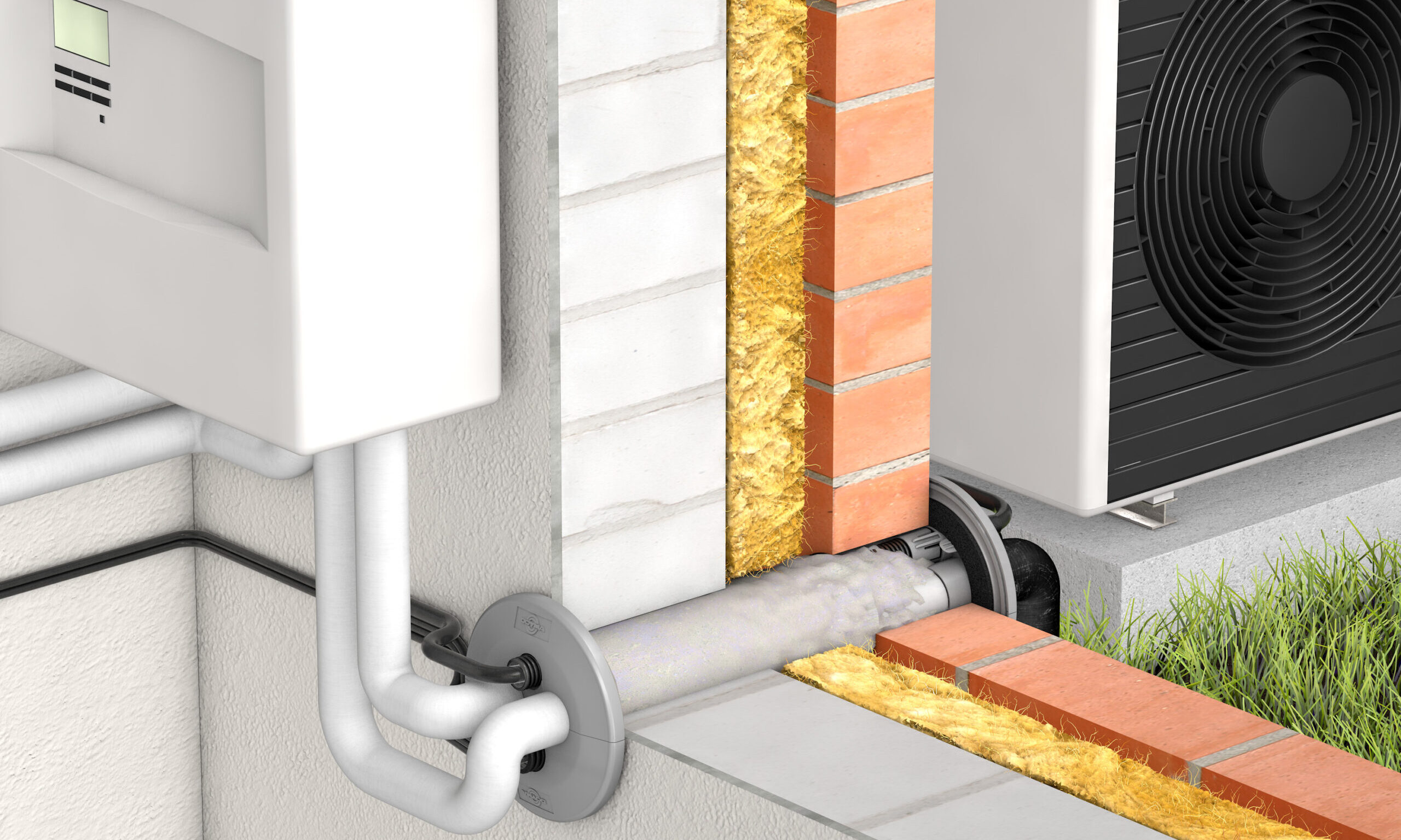 Die Doyma GmbH, Oyten, präsentiert ihre oberirdische Wanddurchführung „Doymafix HP/O-S“ für Luft/Wasser-Wärmepumpen in Split-Ausführung. Aufgrund ihrer Spezifikationen ist sie laut Hersteller auch für die Leitungseinführung von Klimaanlagen geeignet. Sie kombiniert die Durchführung von mehreren Leitungen in einer Wanddurchführung. Möglich wird dies durch die getrennte Verlegung von Rohren und Kabeln sowie die separate Führung der Spannungs- und Steuerleitungen. Dabei ist die Doymafix HP/O-S schlagregendicht und besitzt eine Wärmedämmung. Die Gasdichtigkeit ermöglicht eine Installation innerhalb des Schutzbereiches