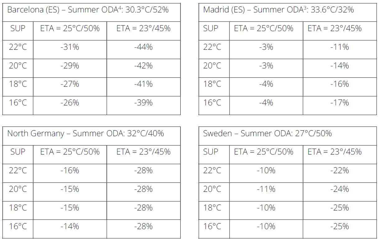 Tabelle 1: Beispiele für prozentuale Einsparungen an benötigter Kälteleistung zur Luftkonditionierung durch eine ergänzende Feuchterückgewinnung für verschiedene Standorte und verschiedene Betriebsbedingungen (Abb. © Eurovent)
