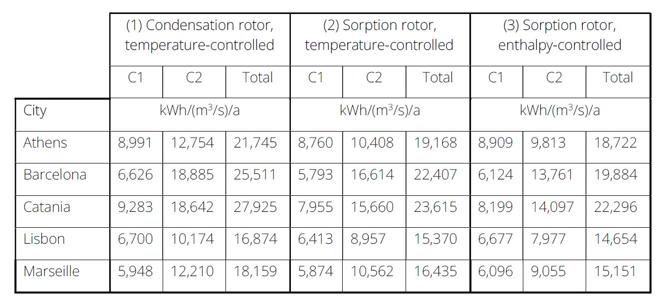 Tabelle 2: Verbräuche an Kälteenergie in kWh/(m³/s) pro Jahr für Szenario 1 (Betrieb der Lüftungsanlage an 65 h pro Woche) beim Einsatz eines Kondensationsrotors beziehungsweise eines temperatur- oder enthalpie-geregelten Sorptionsrotors für verschiedene Standorte (C1 = Vorkühlung, C2 = Nachkühlung) (Abb. © Eurovent)