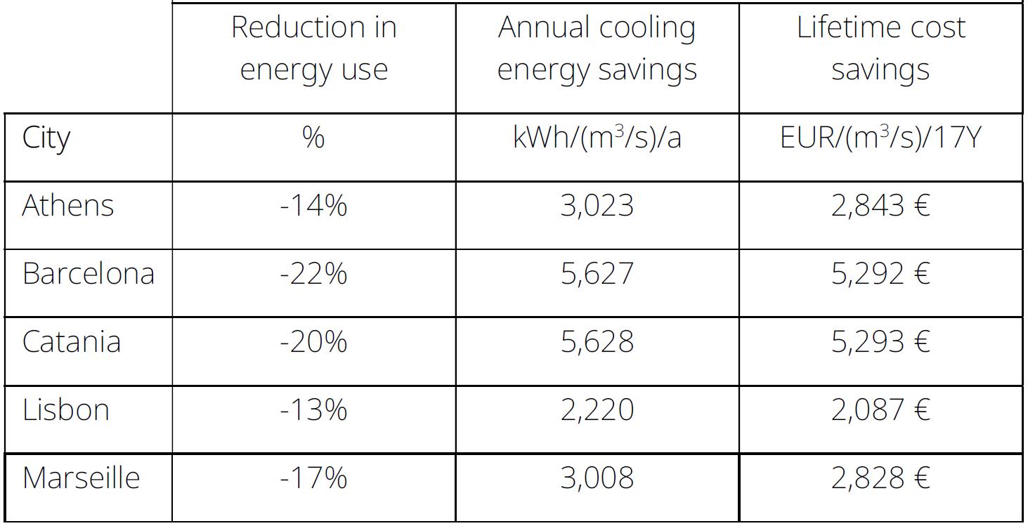 Tabelle 3: Aus den in Tabelle 2 dargestellten Ergebnissen folgen für die verschiedenen Standorte Einsparungen (Vergleich Kondensationsrotor gegenüber enthalpie-geregeltem Sorptionsrotor) an Kälteenergie in Prozent, in kWh(m³/s) pro Jahr und in € pro m³/s Luftförderstrom bezogen auf eine Betriebszeit von 17 Jahren (Abb. © Eurovent)