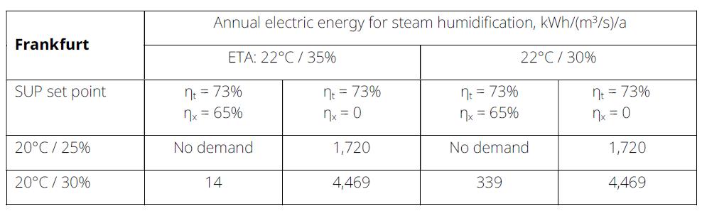 Tabelle 4: Bedarf an jährlicher elektrischer Arbeit in kWh(m³/s) pro Jahr zur Nachbefeuchtung der Außenluft im Winter bei Betrieb eines Sorptionsrotors oder eines Kondensationsrotors bei verschiedenen Zuluft- (SUP) und Abluftbedingungen (ETA) für Szenario 1 am Standort Frankfurt/Main (Abb. © Eurovent)