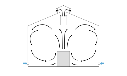 Die Abfuhr von Wärme aus einer Halle erfordert die Förderung eines Luftstroms. Das kann über ein RLT-Gerät erfolgen, oder unter Nutzung natürlicher Druckunterschiede – also durch freie Lüftung. Natürliche Druckunterschiede stellen sich ein durch Wärmefreisetzungen in der Halle, die zu unterschiedlichen Temperaturen und damit unterschiedlichen Luftdichten zwischen drinnen und draußen führen. Ihre Wirkung ist umso stärker, je größer der Druckunterschied ausfällt. Bei tiefen Außentemperaturen und hohen Wärmefreisetzungen im Inneren einer Halle stellen sich also große Druckunterschiede ein. Dagegen können hohe Außentemperaturen den Druckunterschied bis auf null reduzieren, sodass dass die freie Lüftung Wärme nur unzureichend oder gar nicht abführen kann. Diese Schwankungen schließen die Anwendung freier Lüftung aus, wenn Arbeitsplatzgrenzwerte, vorgegebene Schadstoffkonzentrationen oder Temperaturen einzuhalten sind.