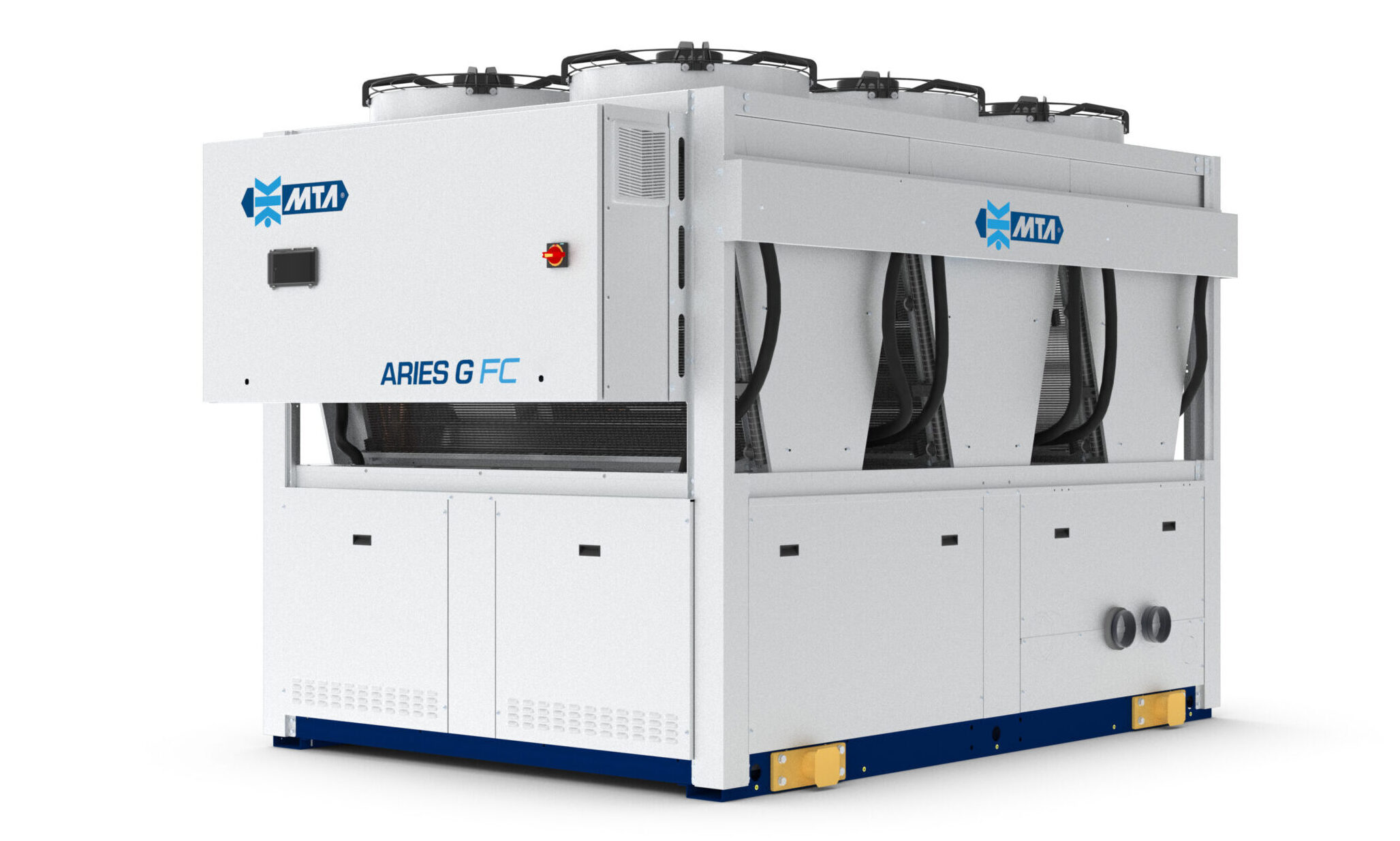 Die MTA Deutschland GmbH, Nettetal, bietet ihre Wasserkühlsätze der Baureihe „Aries G FC“ ab sofort mit freier Kühlung an. Anwender können zwischen sechs Baugrößen von 160 bis 340 kW Kühlleistung wählen. Kältemittel ist R454B (GWP 465). Der Schalldruckpegel, gemessen in 10 m Entfernung, beträgt je nach Gerät maximal 91,3 bis 96,1 dB(A) in normaler Ausführung. Auf Wunsch sind leise Schallkonfigurationen mit Ummantelungen oder Schallschutzhauben für die Verdichter und eine sehr leise Schallkonfiguration mit kompletter Schallschutz-Einhausung erhältlich. Letztere sind laut Hersteller bis zu 5 dB(A) leiser als die Standardausführung. Die Geräte integrieren die freie Kühlung dabei in zwei Betriebsarten: vollständige freie Kühlung, wenn die Außenlufttemperatur mindestens 10 K unter der Temperatur der Prozessflüssigkeit liegt und teilweise freie Kühlung, wenn die Außenlufttemperatur mindestens 2 K unter der Temperatur der Prozessflüssigkeit liegt. Ansonsten laufen die Geräte im Kältemaschinen-Modus.