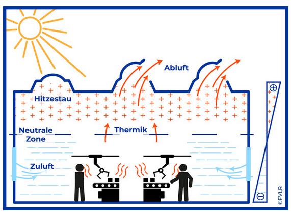 Abbildung 1: Das Grundprinzip der natürlichen Lüftung basiert auf der Thermik: Heiße Luft strömt über Öffnungen im Dach ins Freie. Infolge des dadurch entstehenden leichten Unterdrucks kann kühlere Außenluft als Zuluft durch Öffnungen in die Halle nachströmen. (Abb. © FVLR)