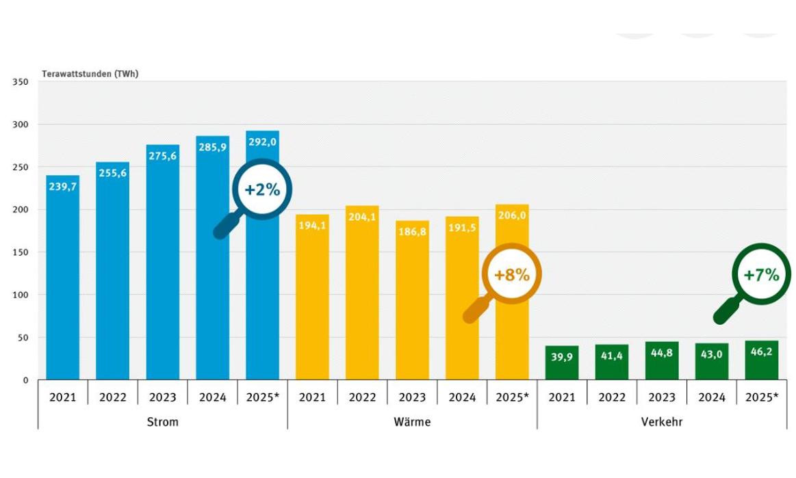 Wegen steigender Einsätze von Biokraftstoffen und hoher Wachstumsraten bei der Elektromobilität stieg der Verbrauch regenerativer Endenergie im Verkehrssektor 2025 gegenüber dem Vorjahr um etwa 7 %. Im Straßen- und Schienenverkehr wurden etwa 11 TWh regenerativer Strom verbraucht. Dies entspricht einem Anstieg um etwa 17 % im Vergleich zu 2024.