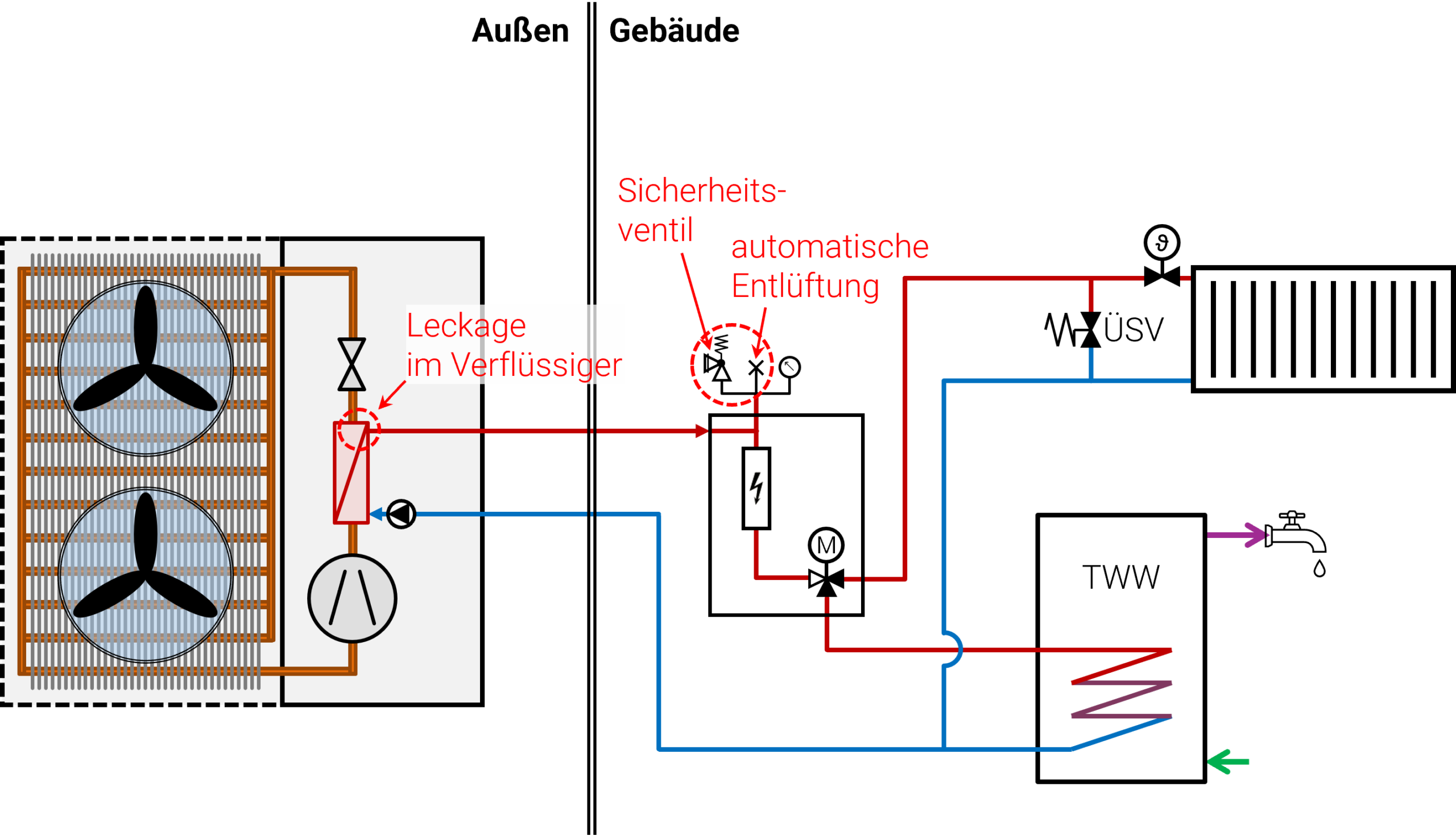 Ausgangspunkt für die Diskussionen war ein Schadensfall aus dem Jahr 2020, bei dem es zu einer Explosion im Anbau eines Wohngebäudes kam, in dem sich der Heizungsraum mit Hydraulik-Installationen befand. In der betroffenen Anlage hat laut Schadensgutachten eine Leckage innerhalb des Platten-Wärmeübertragers (Verflüssiger) einer außen aufgestellten Luft/Wasser-WP mit Propan als Kältemittel (R290, GWP 0,06) in Monoblock-Bauweise vorgelegen. Ursächlich für die Entstehung der Leckage war demnach Frosteinwirkung. Infolgedessen sei Kältemittel in den Wasserkreislauf eingedrungen und vermutlich durch ein automatisches Entlüftungsventil oder das Sicherheitsventil in den Heizungsraum entwichen (siehe Abbildung 1). Dort ist laut Schadensgutachten ein zündfähiges Gemisch entstanden, was in Kombination mit einer Zündquelle schließlich zur Explosion geführt habe. Der dargestellte Schadenfall sei jedoch als sehr seltene Kausalkette zahlreicher ungünstiger Faktoren einzustufen.