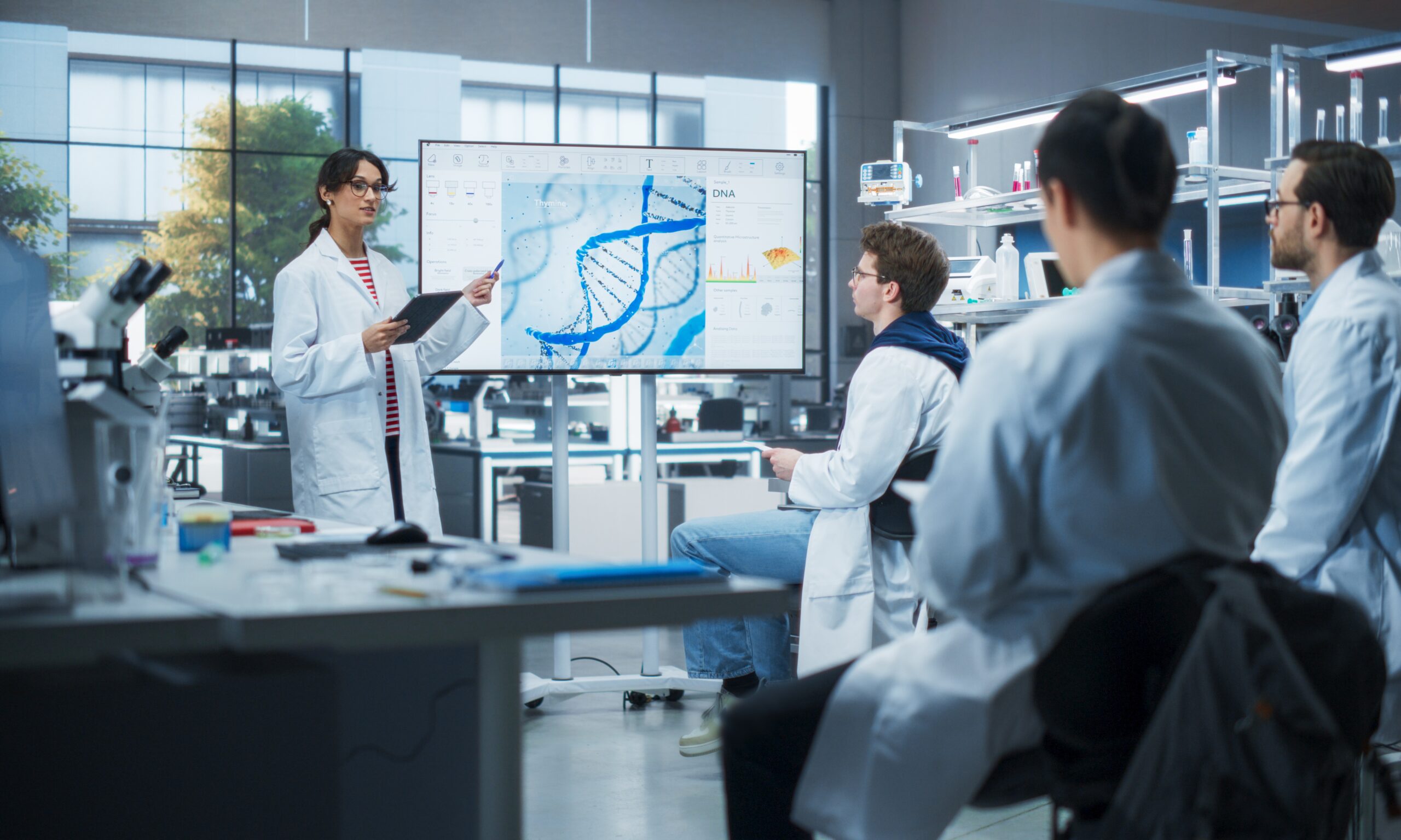 Eine Gruppe von Geschäftsleuten sitzt in einem modernen Konferenzraum um einen Tisch, während einer von ihnen steht und spricht.