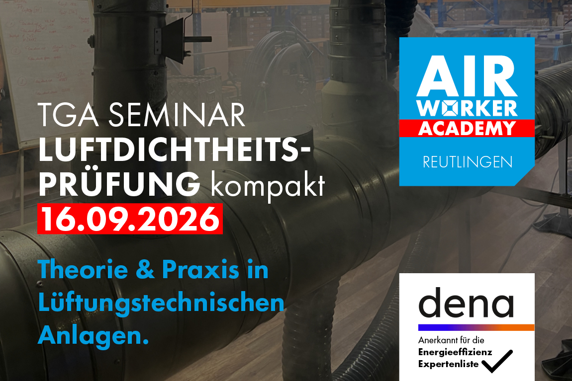 AIRWORKER Akademie Bierwiesenstraße 7, Reutlingen-Gönningen, GermanyDas DENA‑anerkannte, eintägige Seminar vermittelt praxisnah die Grundlagen und Durchführung der Luftdichtheitsprüfung an RLT‑Anlagen. Schwerpunkte sind normgerechte Messverfahren, die Bewertung von Luftleckagen sowie die sichere Interpretation der Ergebnisse. Praktische Messungen und Analysen direkt an einer RLT‑Anlage gewährleisten einen hohen Praxisbezug. Behandelt werden Dichtheitsanforderungen, relevante Regelwerke, messtechnische Grundlagen, die Durchführung der Luftleckageprüfung sowie die Erstellung eines Prüfberichts. Dieses Seminar ist optimal geeignet für Planer, Anlagenerrichter, Facility‑Management, Betreiber sowie Service‑ und Wartungstechniker. -