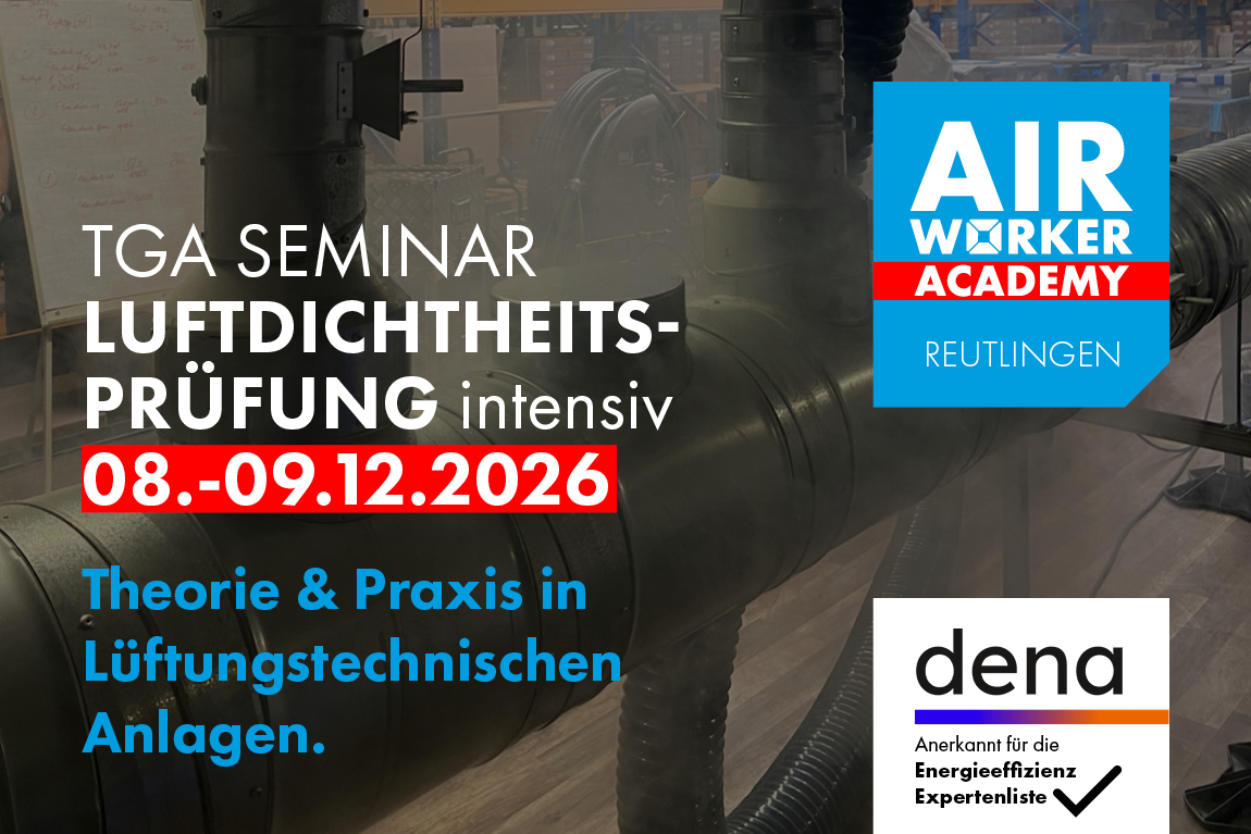 Das DENA‑anerkannte, zweitägige Seminar vermittelt praxisnahe Techniken zur Luftdichtheitsprüfung einschließlich Leckagesuche und ‑bewertung in Luftleitsystemen. Durch praktische Messungen und anschließende Analysen direkt an einer RLT‑Anlage vertiefen die Teilnehmenden ihr Fachwissen. Inhalte sind messtechnische Grundlagen, die Ermittlung von Oberflächen nach DIN EN 14239, die Durchführung und Bewertung von Leckageprüfungen sowie die Erstellung eines Inspektionsberichts. Optimal geeignet für Planer, Anlagenerrichter, Facility‑Management, Betreiber sowie Service‑ und Instandhaltungstechniker.